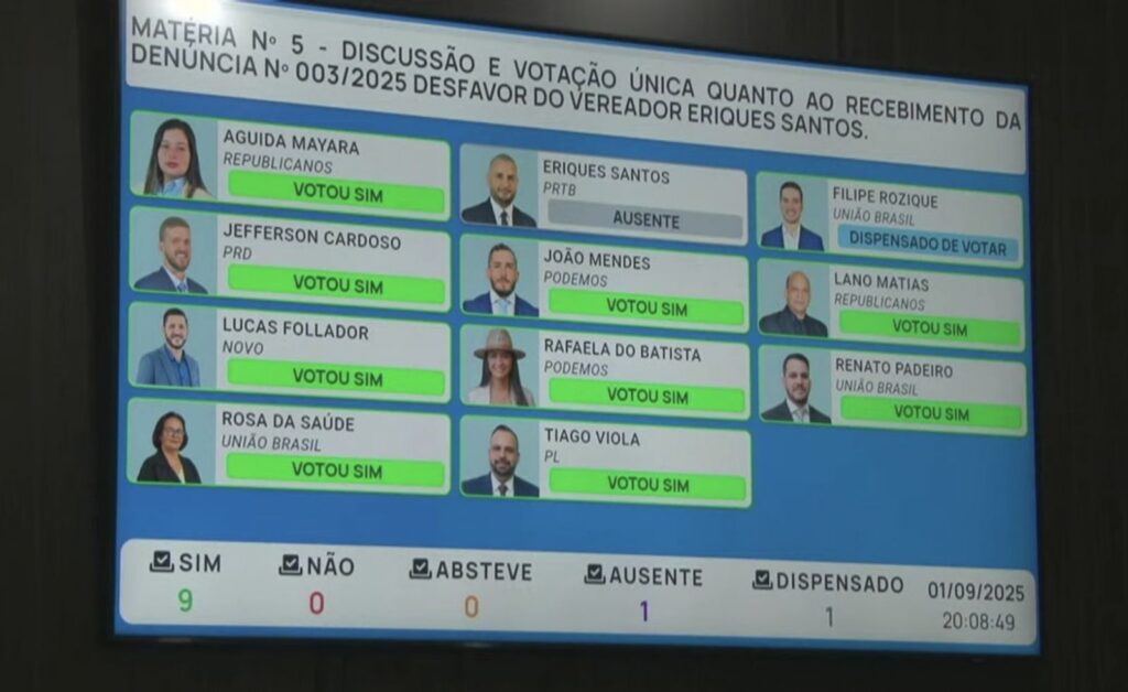 Dos 11 parlamentares, nove votaram a favor do recebimento da denúncia. O presidente da Casa não participa da votação, e o vereador denunciado esteve ausente da sessão.