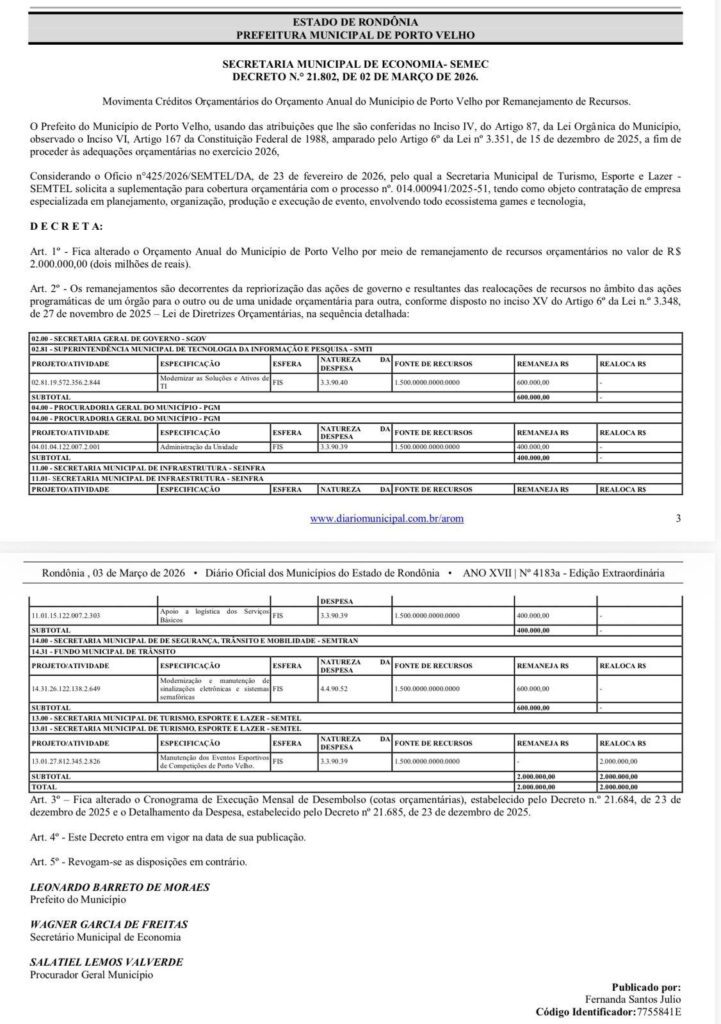 De acordo com o Decreto nº 21.802, publicado no Diário Oficial em 03 de março de 2026, a prefeitura realizou o remanejamento de R$ 2 milhões no orçamento municipal para viabilizar o evento. Os recursos foram retirados de quatro áreas da administração pública: SMTI – Superintendência Municipal de Tecnologia da Informação (R$ 600 mil de ações de modernização de tecnologia).