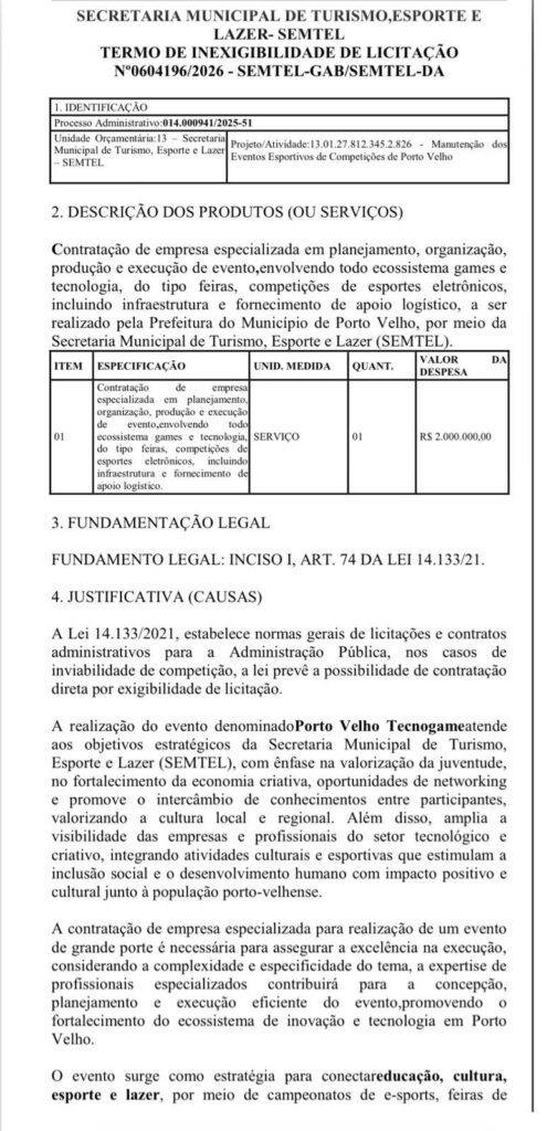A contratação foi realizada por meio da Inexigibilidade de Licitação vinculada ao processo administrativo nº 014.000941/2025-51, que prevê a contratação da empresa Ayra Hub Inovações e Tecnologia Ltda para realizar o evento denominado Porto Velho Tecnogame, previsto para ocorrer nos dias 21 e 22 de março de 2026.