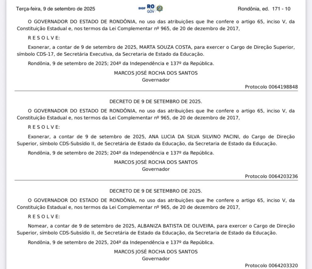 O governador Marcos Rocha (UB) exonerou, nesta terça-feira (09), a cúpula da Secretaria de Estado da Educação (Seduc) e nomeou uma nova gestora para a pasta. As saídas de Ana Lúcia Pacini, então secretária de Educação, e de Marta Costa, que ocupava o cargo de secretária-executiva, foram oficializadas no Diário Oficial.