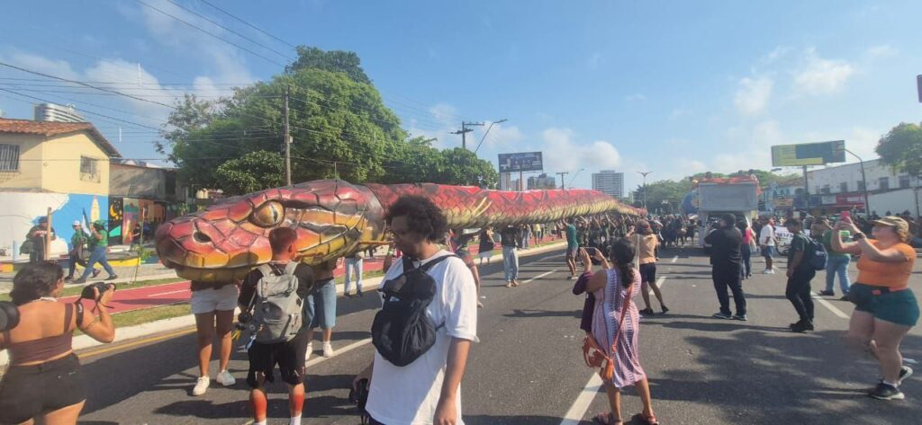 Logo na largada, símbolos da floresta marcaram o tom do ato. Uma enorme cobra amazônica, carregada pelos manifestantes, percorreu todo o trajeto com o lema “Financiamento direto para quem cuida das florestas”. A Boiúna, figura lendária da região, também ganhou vida no percurso, incorporando o imaginário tradicional à defesa da natureza e dos territórios.