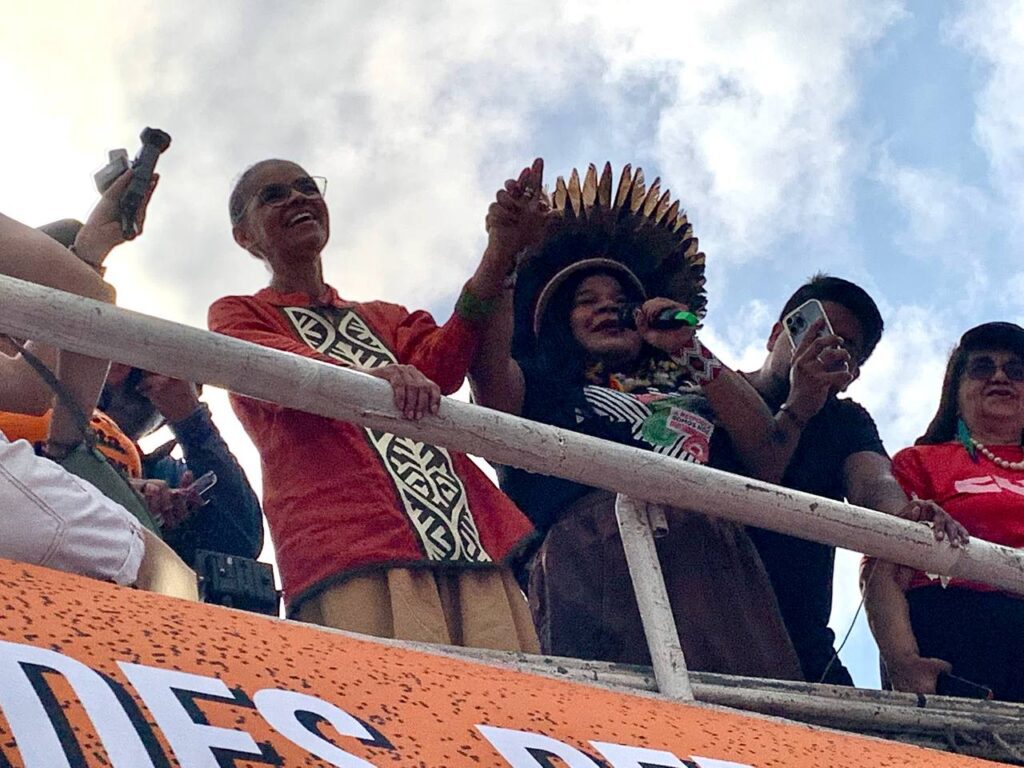 A intervenção ganhou ainda mais visibilidade com a presença de Marina Silva e Sônia Guajajara, duas das principais vozes da pauta socioambiental no país.