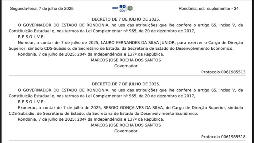 Sérgio estava à frente da pasta há dois anos e meio, período no qual liderou ações voltadas à promoção de investimentos, incentivo ao setor produtivo e fortalecimento da economia rondoniense.