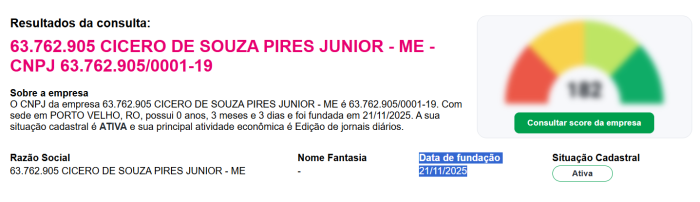 Conforme dados públicos, a empresa 63.762.905 Cícero de Souza Pires Junior – ME (CNPJ 63.762.905/0001-19) foi constituída em 21 de novembro de 2025, com sede em Porto Velho. A atividade econômica principal registrada é a edição de jornais diários, e a situação cadastral consta como ativa.